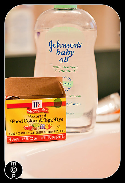 I added a couple of drops of meals coloring into the water and splashed in a couple of drops of child oil.